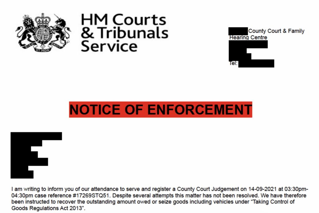 | LEGAL NOTICE FOR [YOUR NAME] Enforcement & Collections agents will be attending [HOUSE NUMBER] [POSTCODE] on [DATE] between 6am-6pm in relation to your outstanding balance. Despite numerous attempts to contact you for resolution, we have been unable to reach you. This matter has now been passed on to collections. Please make payment immediately or your possessions may be listed for removal and you may incur additional costs. If you are in any asset, legal or debt protection scheme, you will need any relevant documents readily available |